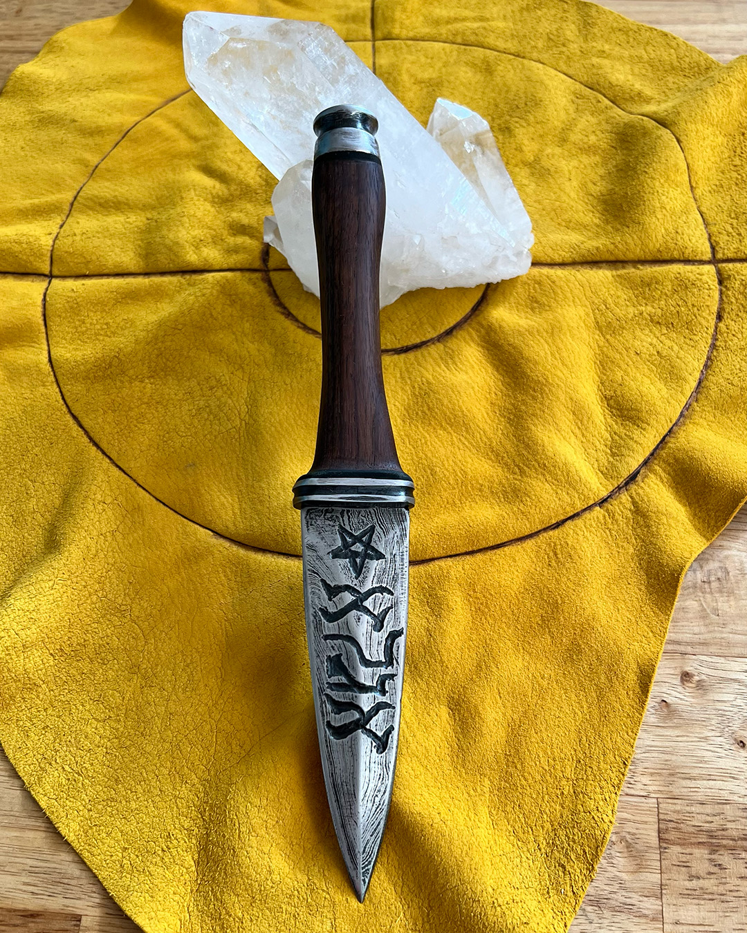 Damascus Steel & Walnut – this one of a kind ritual knife features a Damascus steel blade carved with the Kabbalistic Notarikon A.G.L.A. (Atah Gibor Leolam Adonai) and its Hebrew letter form on opposite sides.