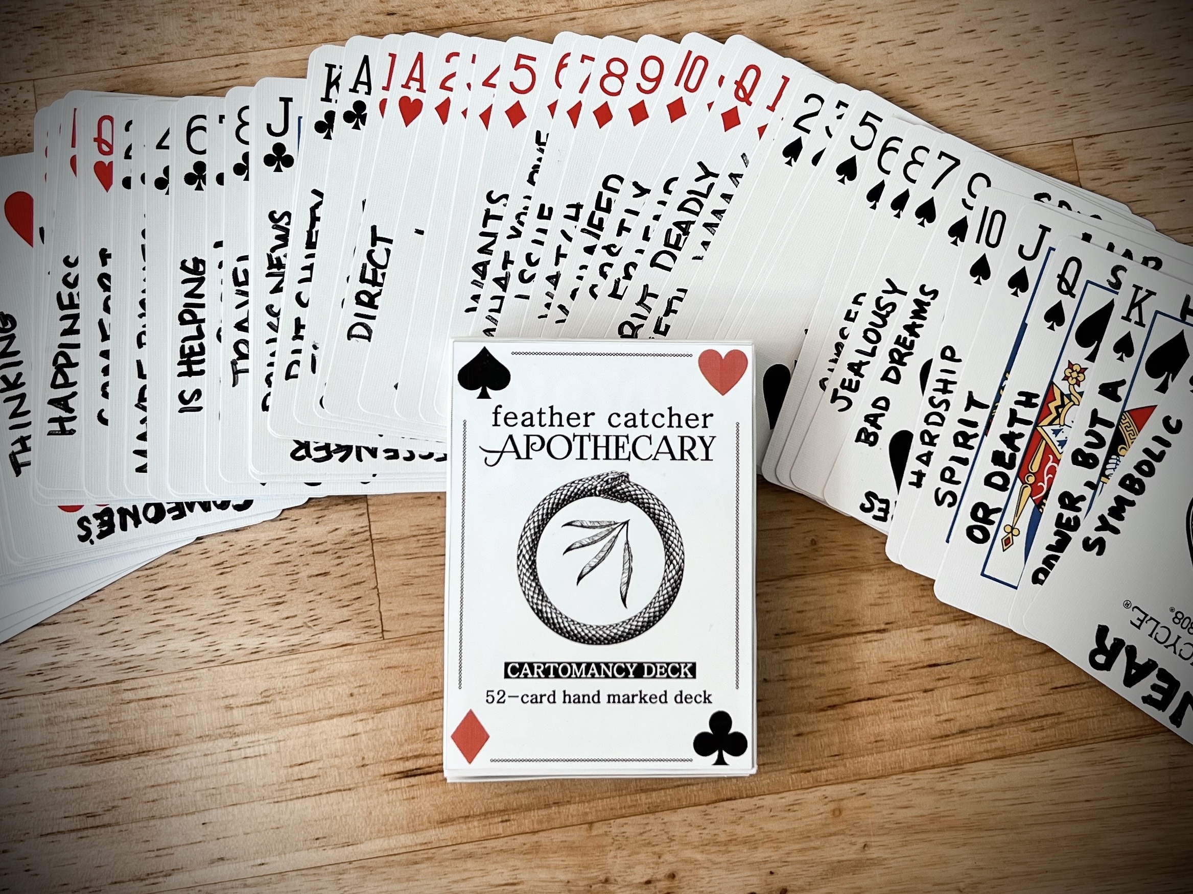 Adapted from a traditional Bicycle black playing card deck, each card has been hand marked and transformed into a cartomancy deck. This deck features cartomancy keywords, designed to support intuitive reading and traditional divination practices. Each card features handwritten markings that connect to classic interpretations—offering a bridge between playing card divination and intuitive insight.