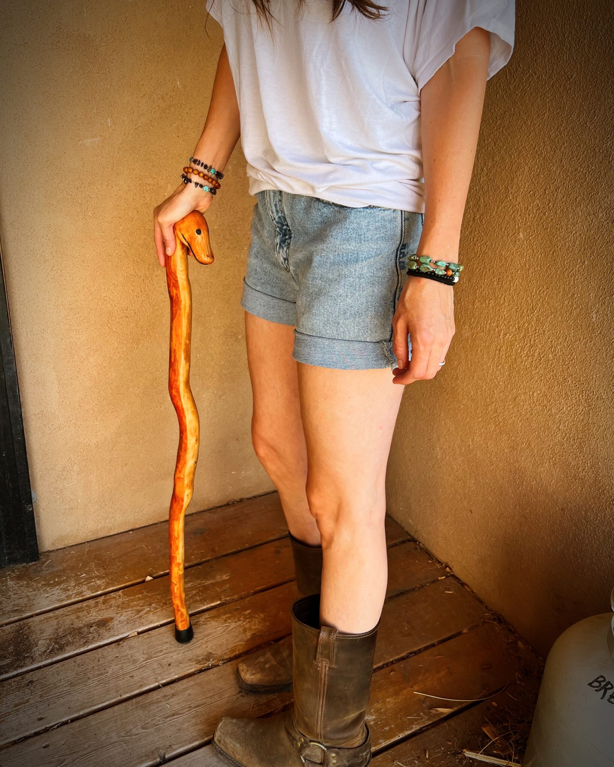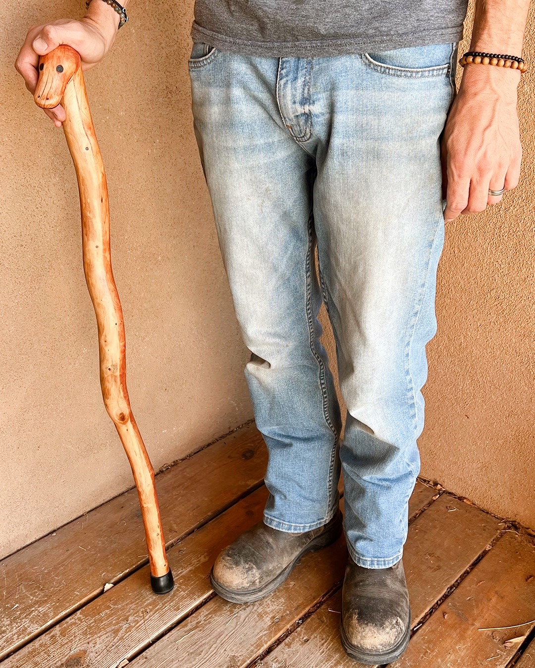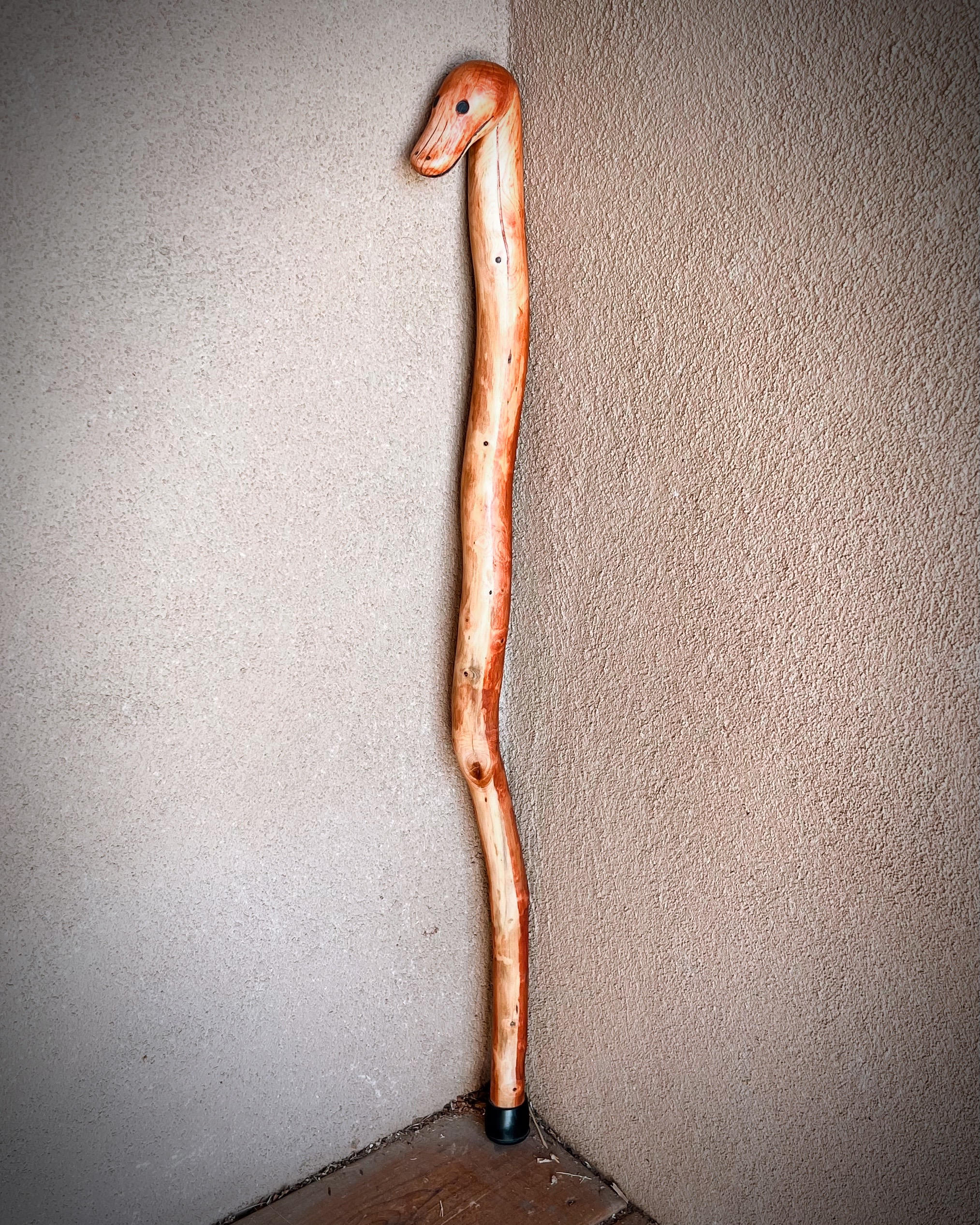 Handcrafted with care and reverence, this one-of-a-kind cane was hand-carved from a pruned branch of one of our juniper trees. This is Cory‘s homage to the serpent as a symbol of wisdom, transformation, and protection. He noticed the branch’s natural curvature resembled the form of a snake and carved it to accentuate the serpent’s shape—burning the eyes and mouth using pyrography to bring its quiet spirit to life. It’s finished with a rich gunstock stain and beeswax to preserve its warmth and character.